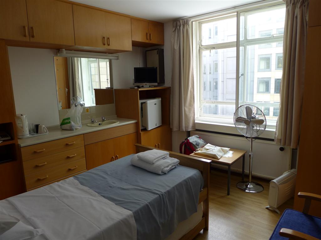 As I don't live anywhere near St Barts, I was put up in Gloucester House across the road from the main hospital that night. This compares with a University Halls of Residence or a large Youth Hostel and has a rather unwelcoming entrance with a multitude of buzzers and intercoms along with broken fittings and scribbled labels. Once you get in (we tried the 'accommodation' buzzer first and were then directed to the 'office' buzzer), you are inducted and provided with your own room which has a single bed, a wash hand basin, a fridge, a kettle with mugs, and the all important TV (but no access to WiFi). It does however have a second single bed which pulls out from underneath the main bed for if someone is staying with you. With two in the room it is a bit tight, but manageable.