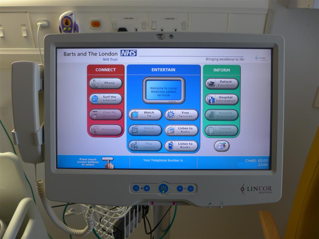 There is no TV or any fixed entertainment at all in the room and all the WiFi's are locked. The hospital does however provide an entertainment system that you purchase credits for, either take some headphones with you or you can buy them from the machine at the same time as your credits. This entertainment system is a TV, radio, audio books and some internet access combined into a basic touch screen edifice. Wipe any images of iPad's from your mind or you will be sorely disappointed. Think more airport flight check-in touchscreen. There is no loudspeaker in the system so headphones are required, unless you want to read subtitles.